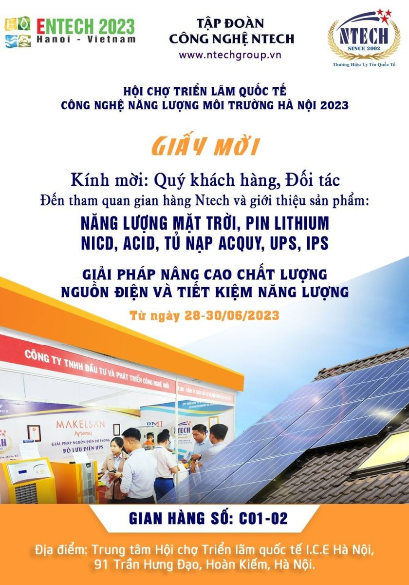 Chào bạn, NTECH – Nhà cung cấp hàng đầu về công nghệ năng lượng bền vững và bảo vệ môi trường, hân hạnh thông báo rằng chúng tôi sẽ tham gia Hội Chợ Triển Lãm Quốc Tế Công Nghệ Năng Lượng Môi Trường Hà Nội 2023, diễn ra từ [Ngày 28/6/2023] đến [Ngày 30/6/2023] tại [Trung tâm hội chợ triển lãm quốc tế I.C.E Hà Nội]. Chúng tôi xin trân trọng mời bạn đến thăm gian hàng của chúng tôi tại [Số gian hàng C01-02].